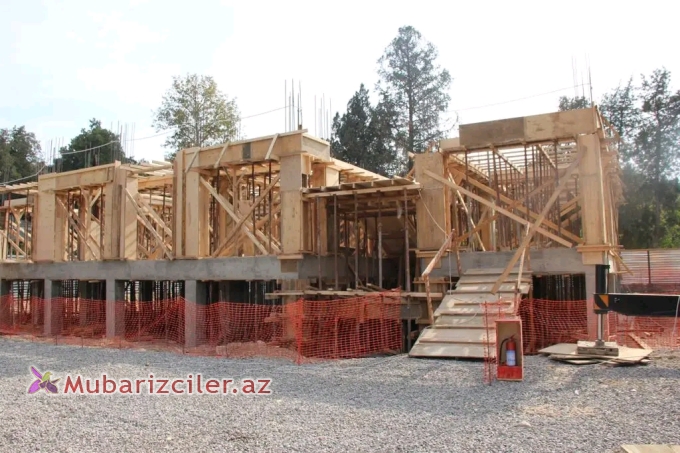 Goranboy rayon Dəliməmmədli şəhərində 4 mərtəbəli 16 mənzilli yaşayış binasının tikinti işləri surətlə davam etdirilir - FOTO 0