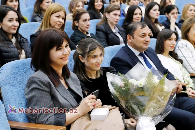Daha sonra idarə müdiri Anar Qədiməliyev tərəfindən Zəkiyyə Hüseynovaya layiq görüldüyü qızıl nişan təqdim edilib.