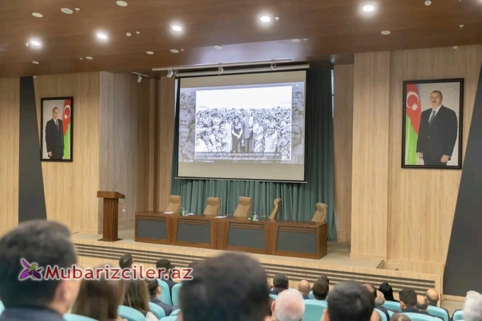 Daha sonra “Ulu Öndər Heydər Əliyevin kənd təsərrüfatının inkişafında rolu” mövzusunda tədbir başlayıb. Tədbirdə öncə Azərbaycan Respublikasının Dövlət Himni səsləndirilib, Ümummilli Lider Heydər Əliyev və Vətən uğrunda canından keçən qəhrəman şəhidlərimizin əziz xatirəsi bir dəqiqəlik sükutla yad edilib.
