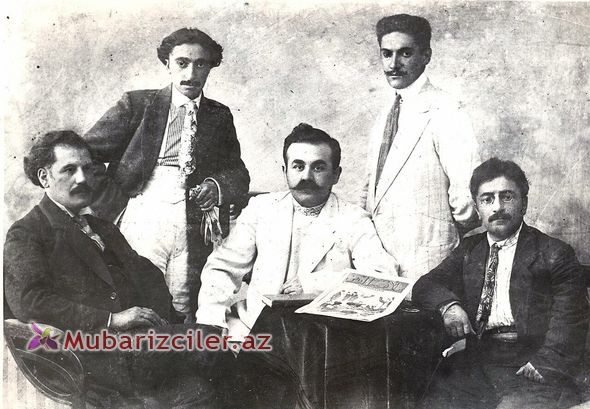 Soldan sağa: Əbdürrəhim bəy Haqverdiyev, Rzaqulu Nəcəfov, Salman Mümtaz, Zeynal Məmmədov, Əliqulu Qəmküsar. Tiflis, 1913