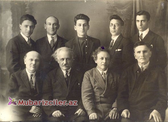 Bakı, 1930-cu il. Ayaq üstə olanlar (soldan sağa): Asəf Zeynallı, Süleyman Rüstəm, Rəsul Rza, Cəfər Cabbarlı, Əfrasiyab Bədəlbəyli. Aşağıdakılar (soldan sağa): Anton Mailyan, Əbdürrəhim bəy Haqverdiyev, Gibo Kornelli, Rzaqulu Nəcəfov