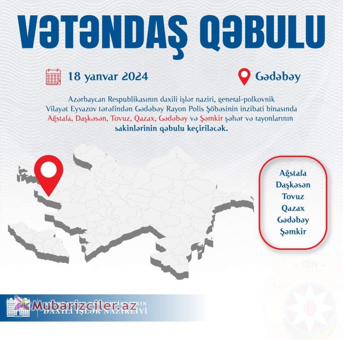 Azərbaycan Respublikasının daxili işlər naziri general-polkovnik Vilayət Eyvazov tərəfindən 2024-cü il yanvar ayının 18-də Gədəbəy Rayon Polis Şöbəsinin inzibati binasında Ağstafa, Daşkəsən, Tovuz, Qazax, Gədəbəy və Şəmkir şəhər və rayonlarının sakinlərinin qəbulu keçiriləcək.