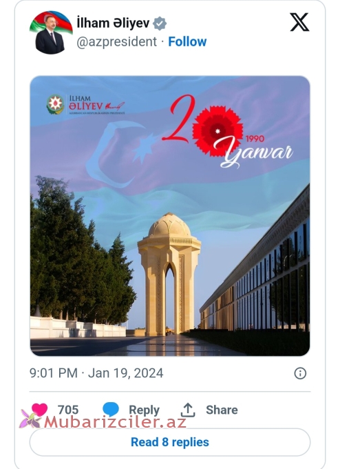 Azərbaycan Respublikasının Prezidenti İlham Əliyev 20 Yanvar faciəsinin ildönümü ilə əlaqədar sosial şəbəkə hesablarında paylaşım edib.