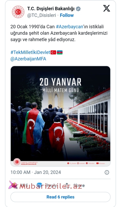 “20 Yanvar 1990-cı ildə can Azərbaycanın müstəqilliyi uğrunda şəhid olan azərbaycanlı qardaşlarımızı hörmət və rəhmətlə yad edirik”, - deyə başsağlığında bildirilib.