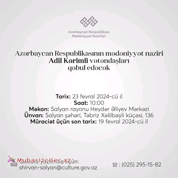 Mərkəzi icra hakimiyyəti orqanları və digər idarəetmə qurumlarının rəhbərlərinin şəhər və rayonlarda vətəndaşların qəbulu cədvəlinə əsasən Azərbaycan Respublikasının mədəniyyət naziri Adil Kərimli tərəfindən 2024-cü il 23 fevral tarixində saat 10:00-da Salyan rayonu Heydər Əliyev Mərkəzində (Ünvan: Salyan şəhəri, Təbriz Xəlilbəyli küçəsi, 136) Salyan, Şirvan, Hacıqabul, Biləsuvar, Neftçala şəhərlərindən olan vətəndaşların qəbulu keçiriləcək.