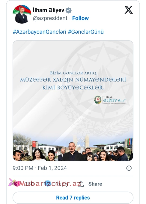 Prezident İlham Əliyev Gənclər Günü ilə bağlı “X” səhifəsində paylaşım edib.