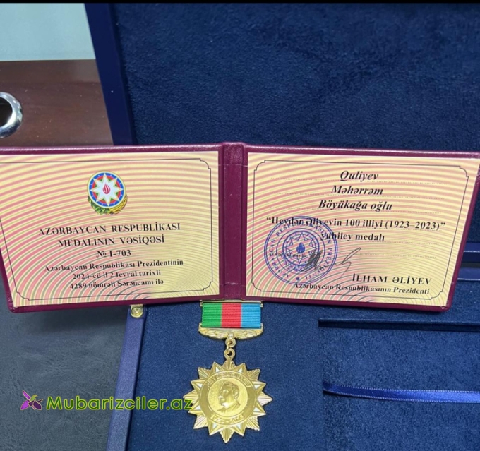 Azərbaycan Respublikasının Prezidenti cənab İlham Əliyevin Sərəncamı ilə Quliyev Məhərrəm Böyükağa oğlu "Heydər Əliyevin 100 illiyi (1923-2023)" yubiley medalı ilə təltif edilib.