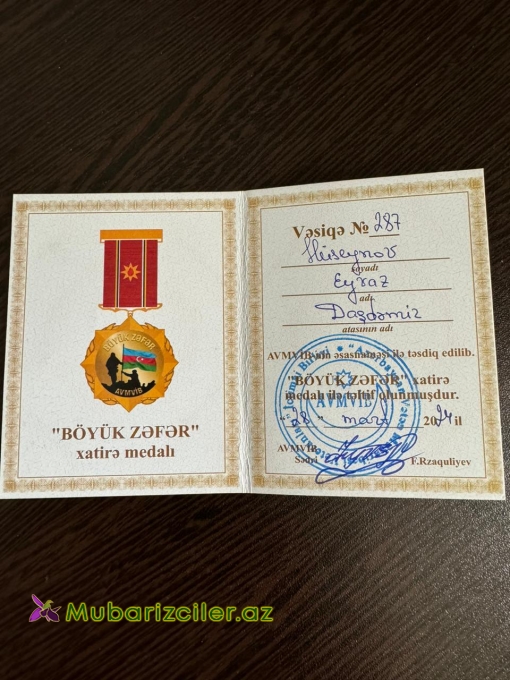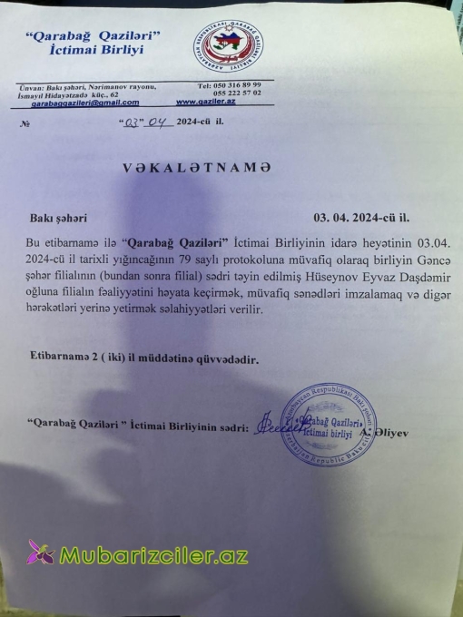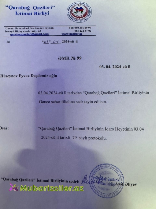 Mubarizciler.az-ın əldə etdiyi məlumata əsasən Asəf Əliyevin imzaladığı əmrə əsasən Hüseynov Eyvaz Daşdəmir oğlu 03.04.2024-cü il tarixdə "Qarabağ Qaziləri" İctimai Birliyinin Gəncə şəhər filialına sədr təyin edilib.