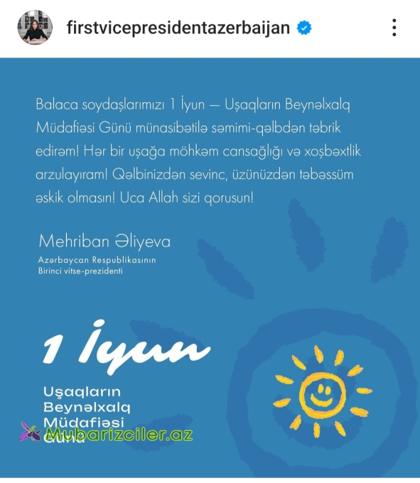 “Balaca soydaşlarımızı 1 İyun - Uşaqların Beynəlxalq Müdafiəsi Günü münasibətilə səmimi qəlbdən təbrik edirəm! Hər bir uşağa möhkəm cansağlığı və xoşbəxtlik arzulayıram! Qəlbinizdən sevinc, üzünüzdən təbəssüm əskik olmasın! Uca Allah sizi qorusun!”