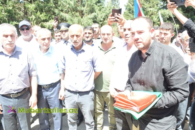 Sonra şəhidin tabutuna bükülmüş Azərbaycanın üçrəngli bayrağı şəhidin oğluna təqdim edilib.