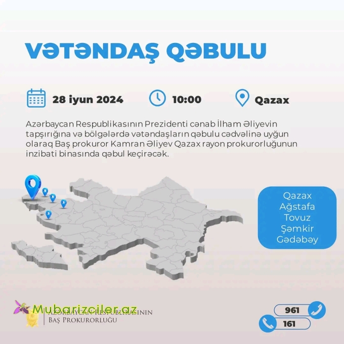 Azərbaycan Respublikasının Prezidenti cənab İlham Əliyevin tapşırığına və bölgələrdə vətəndaşların qəbulu cədvəlinə uyğun olaraq Baş prokuror Kamran Əliyev cari il iyunun 28-də, saat 10:00-da Qazax rayon prokurorluğunun inzibati binasında Qazax, Ağstafa, Tovuz, Şəmkir və Gədəbəy rayon sakinlərinin qəbulunu keçirəcək.