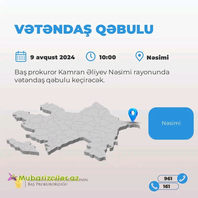Prezident İlham Əliyevin tapşırığı və tövsiyələrinə uyğun olaraq vətəndaş məmnunluğunun və hüquqlarının qorunmasının təmin edilməsi, həmçinin bu sahədə səmərəliliyin artırılması məqsədilə Baş prokuror Kamran Əliyev avqustun 9-da saat 10:00-da Nəsimi rayon prokurorluğunun inzibati binasında rayonun hüquq-mühafizə orqanlarının icraatında olan cinayət işləri və materiallar üzrə, o cümlədən prokurorluq orqanlarının fəaliyyətinə aid məsələlərlə bağlı konkret müraciət və ya şikayəti olan vətəndaşların qəbulunu keçirəcək.