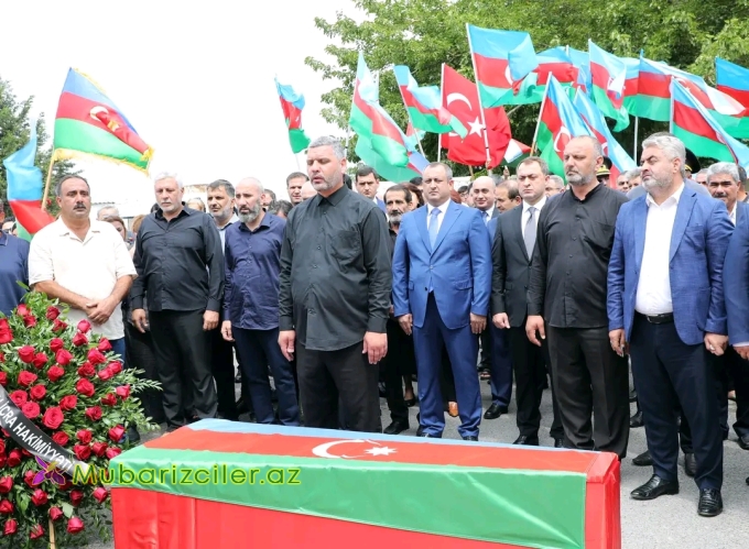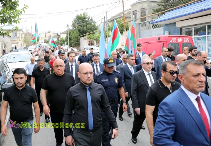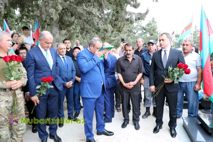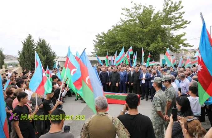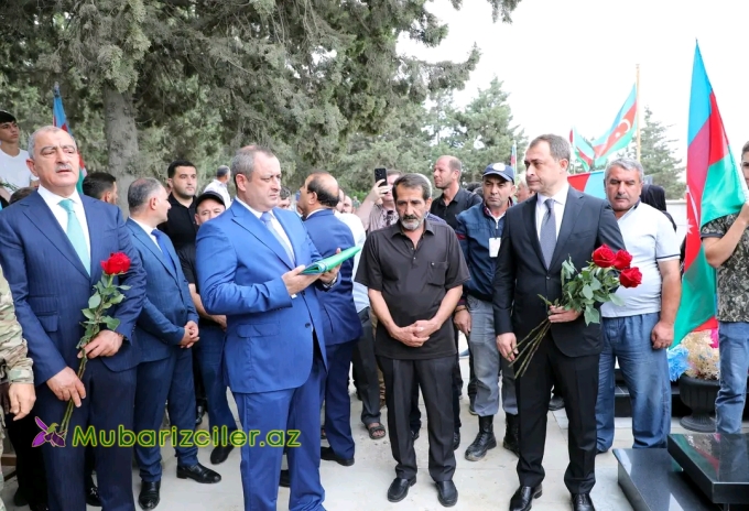 Suraxanı Rayon İcra Hakimiyyətinin başçısı Adil Əliyev tabut üzərindəki üçrəngli Dövlət Bayrağını şəhidin qardaşına təqdim edərək dərin hüznlə başsağlığı verib, səbr diləyib.