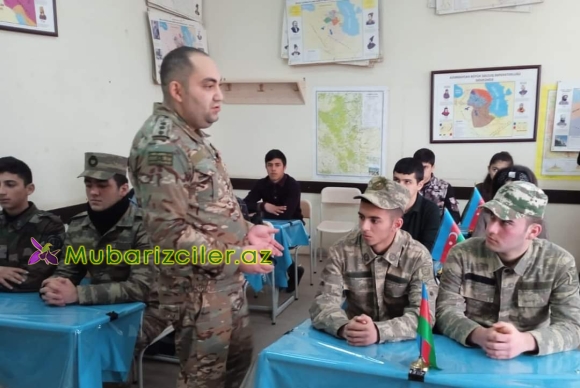 Mubarizciler.az xəbər verir ki, Görüşdə Elnur Xəlilov şagirdlərə Ümummilli Lider Heydər Əliyev müasir Azərbaycan ordusunun quruculuğunda rolu barədə geniş məlumat verdi.