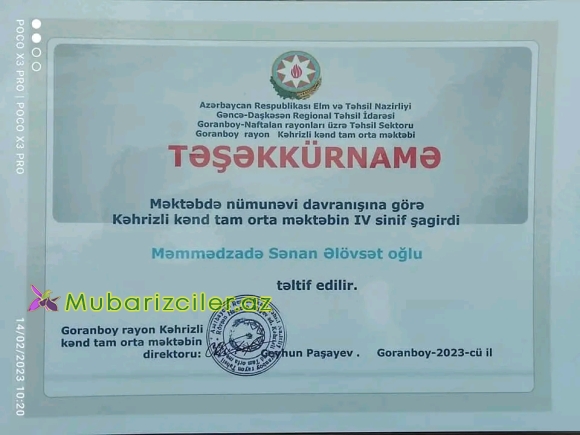 Mubarizciler.az xəbər vetir ki, 14.02.2023- cü il tarixdə Rövşən Əliyev adına Kəhrizli kənd tam orta məktəbin direktoru Ceyhun Paşayev tərəfindən Məktəbin lV sinif şagirdi,