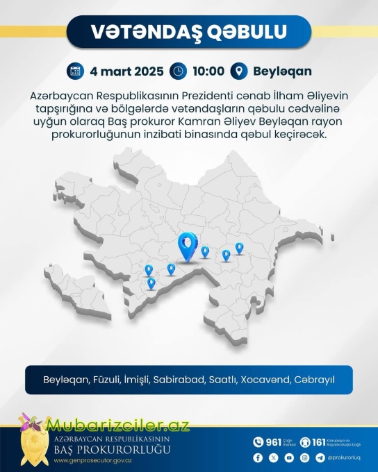 Azərbaycan Respublikasının Prezidenti cənab İlham Əliyevin tapşırığına və bölgələrdə vətəndaşların qəbulu cədvəlinə uyğun olaraq Baş prokuror Kamran Əliyev cari il martın 4-də, saat 10:00-da Beyləqan rayon prokurorluğunun inzibati binasında Beyləqan, Füzuli, İmişli, Sabirabad, Saatlı, Xocavənd və Cəbrayıl rayon sakinlərinin qəbulunu keçirəcək.