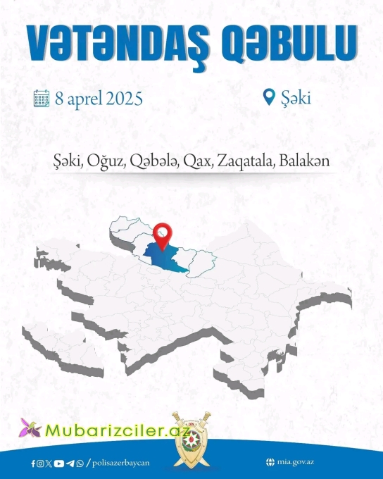 Mubarizciler.az Daxili İşlər Nazirliyinin Mətbuat Xidmətinə istinadən xəbər verir ki, Azərbaycan Respublikasının daxili işlər naziri general-polkovnik Vilayət Eyvazov tərəfindən 2025-ci il aprel ayının 8-də Şəki Şəhər-Rayon Polis Şöbəsinin inzibati binasında Şəki, Balakən, Zaqatala, Qax, Oğuz, Qəbələ şəhər və rayonlarının sakinlərinin qəbulu keçiriləcək.