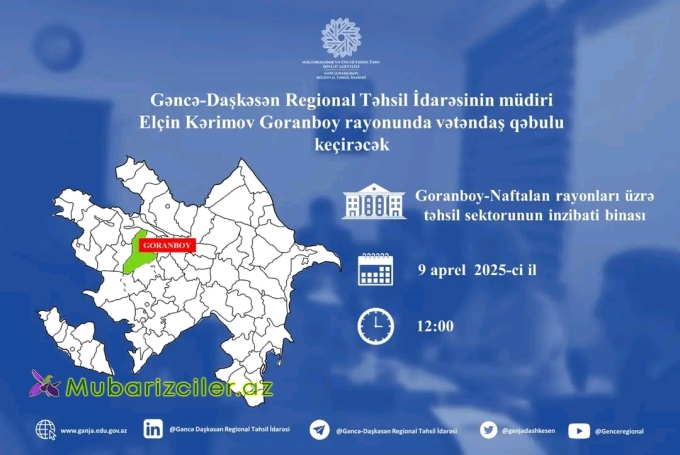 Mubarizciler.az xəbər verir ki, Gəncə-Daşkəsən Regional Təhsil İdarəsinin müdiri Elçin Kərimov aprelin 9-da Goranboy rayonu üzrə təhsil sektorunun inzibati binasında vətəndaş qəbulu keçirəcək.