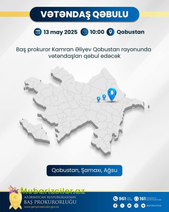 Prezident İlham Əliyevin tapşırığı və tövsiyələrinə uyğun olaraq vətəndaş məmnunluğunun və hüquqlarının qorunmasının təmin edilməsi, həmçinin bu sahədə səmərəliliyin artırılması məqsədilə Baş prokuror Kamran Əliyev mayın 13-də saat 10:00-da Qobustan rayon prokurorluğunun inzibati binasında Qobustan, Şamaxı və Ağsu rayon sakinlərinin qəbulunu keçirəcək.