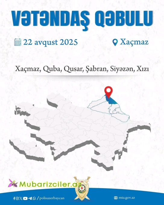 Azərbaycan Respublikasının daxili işlər naziri general-polkovnik Vilayət Eyvazov tərəfindən 2025-ci il avqust ayının 22-də Xaçmaz Rayon Polis Şöbəsinin inzibati binasında Quba, Qusar, Xaçmaz, Şabran, Siyəzən və Xızı şəhər və rayonlarının sakinlərinin qəbulu keçiriləcək.