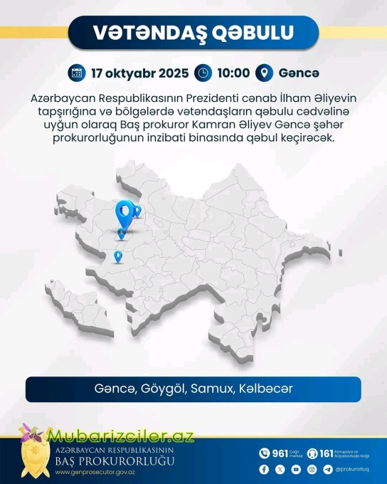 Azərbaycan Respublikasının Prezidenti cənab İlham Əliyevin tapşırığına və bölgələrdə vətəndaşların qəbulu cədvəlinə uyğun olaraq Baş prokuror Kamran Əliyev cari il oktyabrın 17-də, saat 10:00-da Gəncə şəhər prokurorluğunun inzibati binasında Gəncə şəhər, Göygöl, Samux və Kəlbəcər rayon sakinlərinin qəbulunu keçirəcək. Mubarizciler.az xəbər verir ki, Vətəndaşların qəbulla bağlı qeydiyyatı və Gəncə şəhərinə gəlmələrinin təşkili rayon prokurorları tərəfindən həyata keçiriləcək. Vətəndaşlar yaşadıqları ərazi üzrə rayon (şəhər) prokurorluqlarına yazılı və ya şifahi müraciət etməklə yanaşı, Baş Prokurorluğun Sənədlərlə və müraciətlərlə işin təşkili idarəsinin (012) 361-14-07, (012) 361-14-22, (012) 361-01-48 nömrəli telefonları, contact@prosecutor.gov.az elektron poçt ünvanı, həmçinin prokurorluğun sosial şəbəkələrdəki səhifələri (İnstagram, Facebook və X) vasitəsilə də qəbula yazıla bilərlər.