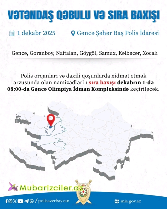 Gəncə Şəhər Baş Polis İdarəsinin inzibati binasında baş tutacaq qəbulda Gəncə, Goranboy, Naftalan, Göygöl, Samux, Kəlbəcər, Xocalı şəhər və rayonlarının sakinləri iştirak edə bilərlər. Qəbula yazılmaq istəyən vətəndaşlar Nazirliyin səlahiyyətlərinə aid məsələlərlə bağlı 30.11.2025-ci il tarixinədək yaşadıqları ərazinin polis orqanına, habelə DİN-in mia.gov.az internet saytı vasitəsilə və sosial şəbəkələrdəki səhifələrinə müraciət edə bilərlər. Polis orqanları və daxili qoşunlarda xidmət etmək arzusunda olan namizədlərin sıra baxışı isə vətəndaş qəbulundan öncə, yəni dekabrın 1-də 08:00-da Gəncə Olimpiya İdman Kompleksində keçiriləcək.