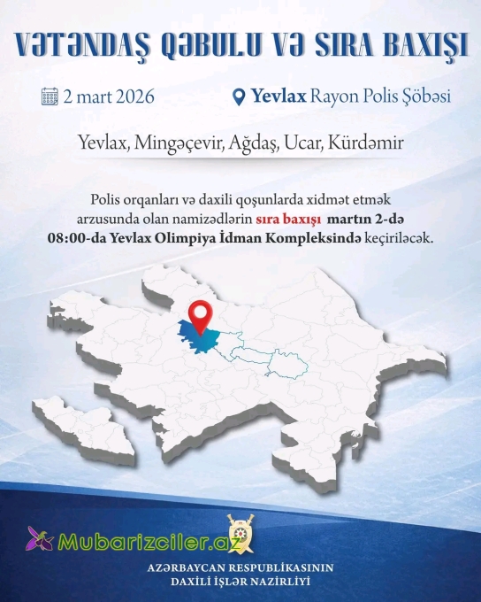 Qəbula yazılmaq istəyən vətəndaşlar Nazirliyin səlahiyyətlərinə aid məsələlərlə bağlı 01.03.2026-cı il tarixinədək yaşadıqları ərazinin polis orqanına, habelə Nazirliyin "E-Polis" mobil tətbiqi, e-xidmet.mia.gov.az elektron xidmət portalı vasitəsilə və sosial şəbəkələrdəki səhifələrinə müraciət edə bilərlər. Polis orqanları və daxili qoşunlarda xidmət etmək arzusunda olan namizədlərin sıra baxışı martın 2-də 08:00-da Yevlax Olimpiya İdman Kompleksində keçiriləcək.